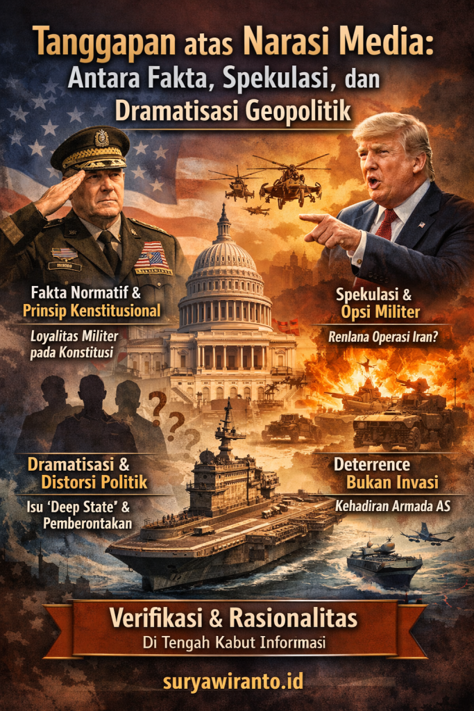 Secara keseluruhan, narasi yang beredar mencerminkan kombinasi antara fakta normatif, spekulasi geopolitik, dan penguatan framing dramatik. Beberapa elemen memang memiliki dasar kebenaran, seperti penegasan loyalitas militer terhadap Konstitusi, keberadaan opsi militer terhadap Iran, serta meningkatnya tensi geopolitik di kawasan.